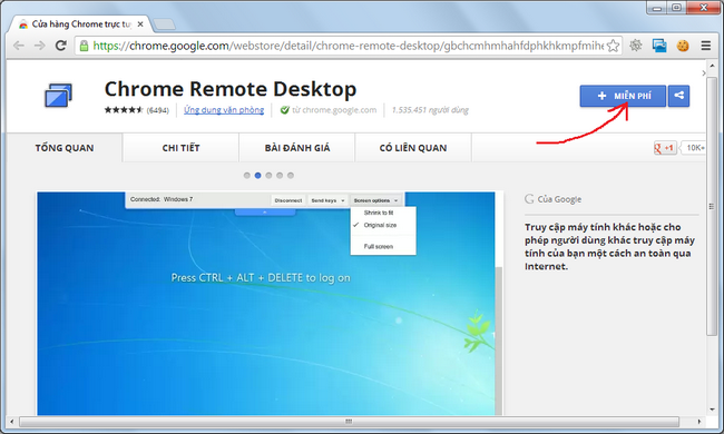 Bấm vào nút "+ Miễn phí" để cài đặt Chrome Remote Desktop. Chờ phần mềm tải xuống và tự động cài đặt trong khoảng 3 phút.