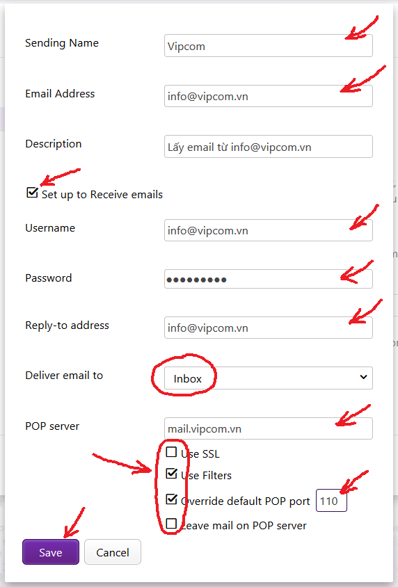 Trên cửa sổ mở ra, nhập đầy đủ thông tin tài khoản email công ty và các lựa chọn như mũi tên trong hình. Nhấn nút Save để xác nhận.