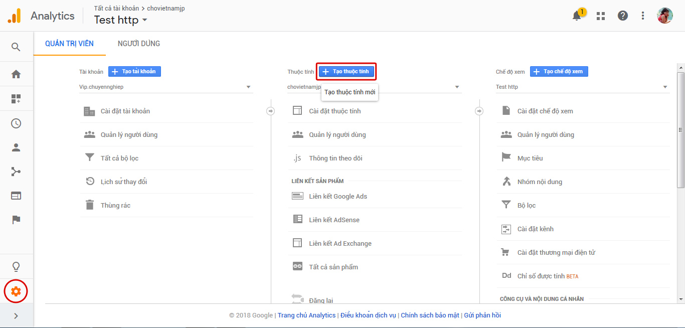 Google cho phép bạn theo dõi nhiều website trong cùng 1 tài khoản Google Analytics. Vì vậy, trong trường hợp bạn đã có tài khoản từ trước, để quản lý thêm một website khác, sau khi đăng nhập Google Analytics, bạn chọn “Quản trị” (biểu tượng bánh răng), trong ô “Thuộc tính” click chọn “Tạo thuộc tính”